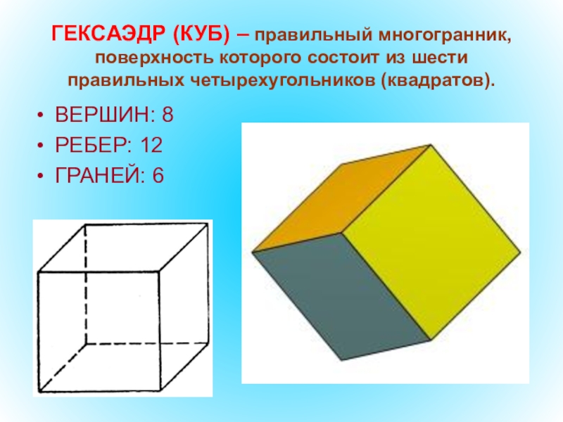 Дайте определение куба и перечислите сколько ребер, вершин, граней.