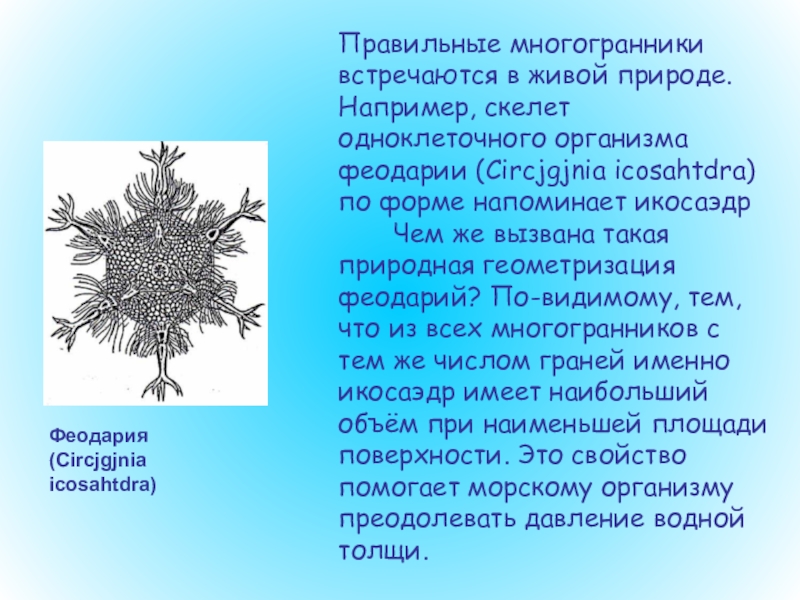 Слайд 85Правильные многогранники встречаются в живой природе. Например, скелет одноклеточного организма феодарии