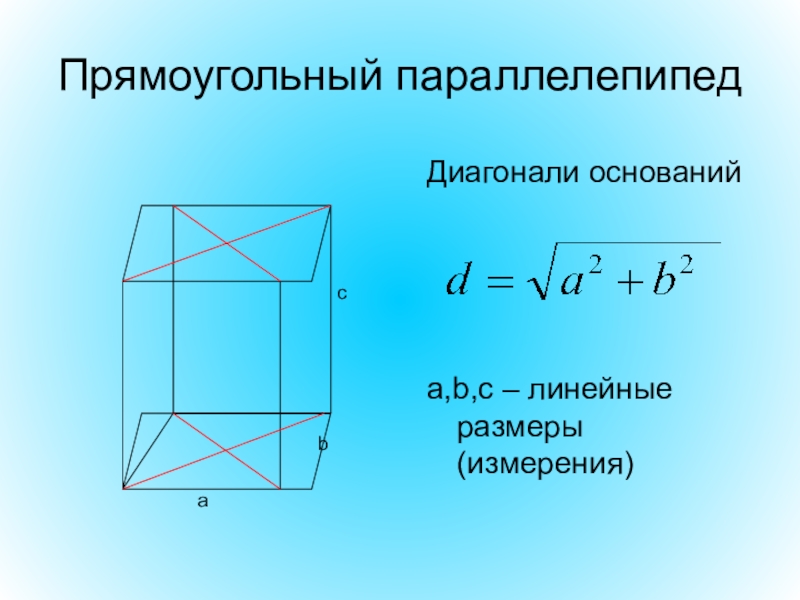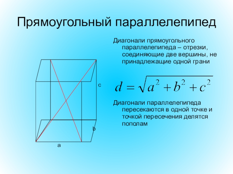 Диагонали прямоугольного параллелепипеда – отрезки, соединяющие две вершины, не принадлежащие
