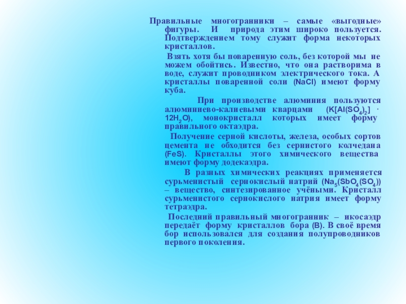Слайд 86Правильные многогранники – самые «выгодные» фигуры. И природа этим широко пользуется.