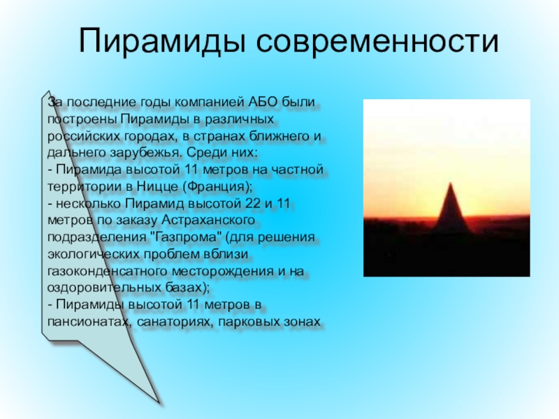 За последние годы компанией АБО были построены Пирамиды в различных