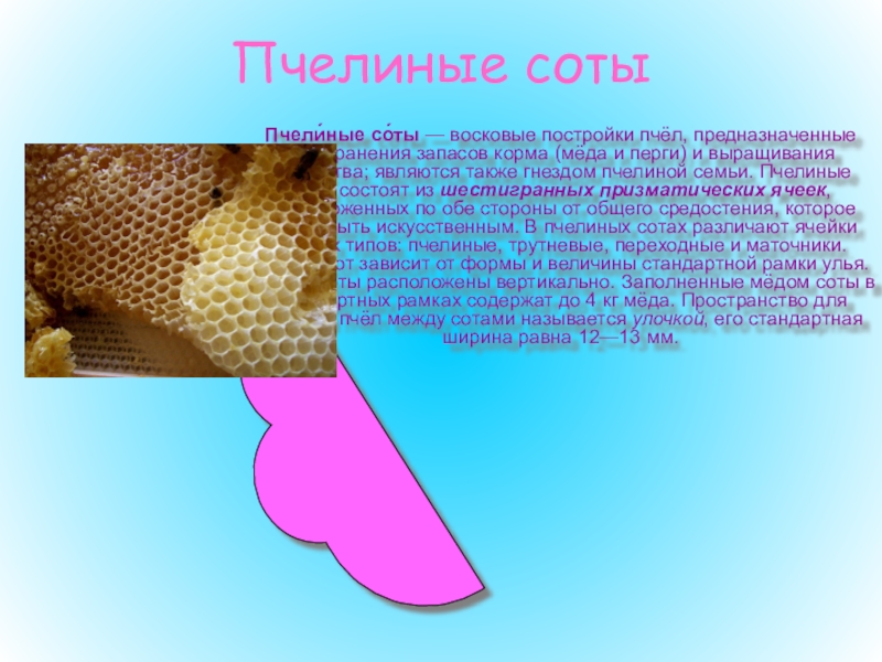 корма (мёда и перги) и выращивания потомства; являются также гнездом пчелиной семьи. Пчелиные соты состоят из шестигранных призматических ячеек, расположенных по обе стороны от общего средостения, которое может быть искусственным. В пчелиных сотах различают ячейки разных типов: пчелиные, трутневые, переходные и маточники. Размер сот зависит от формы и величины стандартной рамки улья. В улье соты расположены вертикально. Заполненные мёдом соты в стандартных рамках содержат до 4 кг мёда. Пространство для прохода пчёл между сотами называется улочкой, его стандартная ширина равна 12—13 мм.