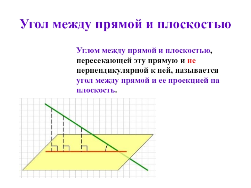 Угол между прямой и плоскостьюУглом между прямой и плоскостью, пересекающей эту прямую и не перпендикулярной к ней, называется угол между прямой и ее проекцией на плоскость.