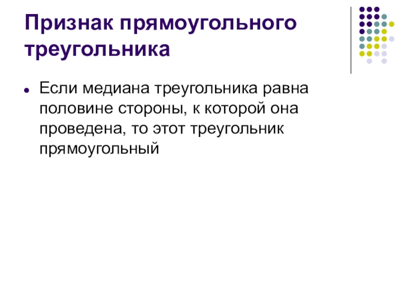 Признак прямоугольного треугольникаЕсли медиана треугольника равна половине стороны, к которой она проведена, то этот треугольник прямоугольный