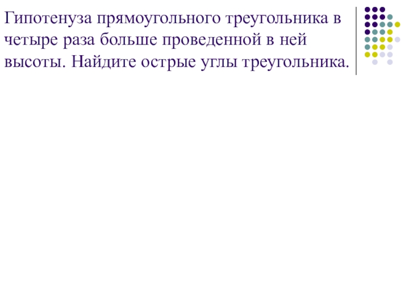 Слайд 9Гипотенуза прямоугольного треугольника в четыре раза больше проведенной в ней высоты.