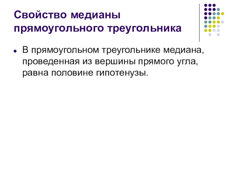 Свойство медианы прямоугольного треугольникаВ прямоугольном треугольнике медиана, проведенная из вершины прямого угла, равна половине гипотенузы.