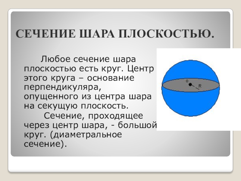 Сечение, проходящее через центр шара, - большой круг. (диаметральное сечение).