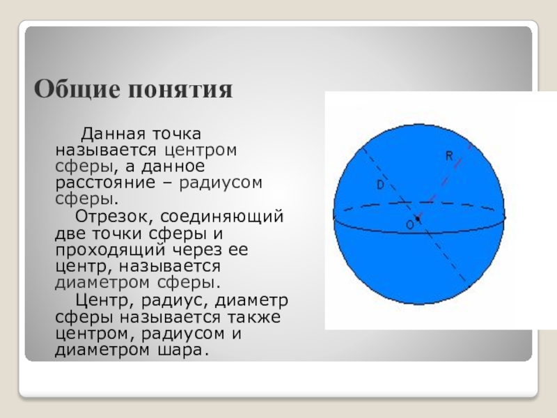 Центр, радиус, диаметр сферы называется также центром, радиусом и диаметром шара.