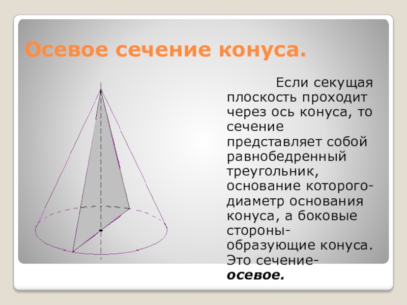 представляет собой равнобедренный треугольник, основание которого- диаметр основания конуса, а боковые стороны- образующие конуса. Это сечение- осевое.