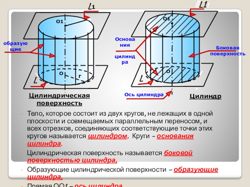 и совмещаемых параллельным переносом, и всех отрезков, соединяющих соответствующие точки этих кругов называется цилиндром. Круги - основания цилиндра.
