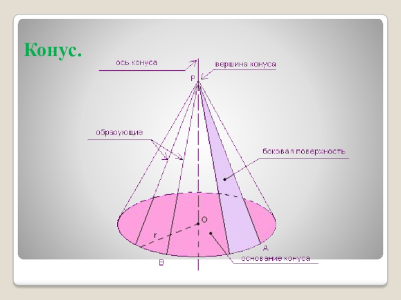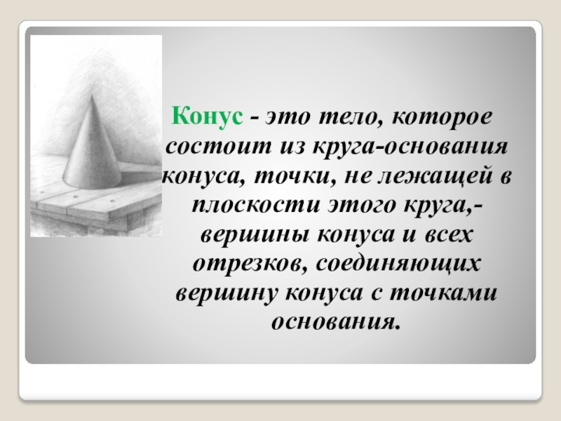 Конус - это тело, которое состоит из круга-основания конуса, точки, не