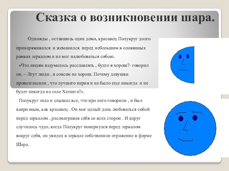 Полукруг знал и слышал все, что про него говорили , и был капризным, как красавец . Он мог целый день любоваться собой перед зеркалом , рассматривая себя со всех сторон . И вдруг случилось чудо, когда Полукруг повернулся перед зеркалом вокруг себя, он увидел в зеркале собственное отражение в форме Шара.