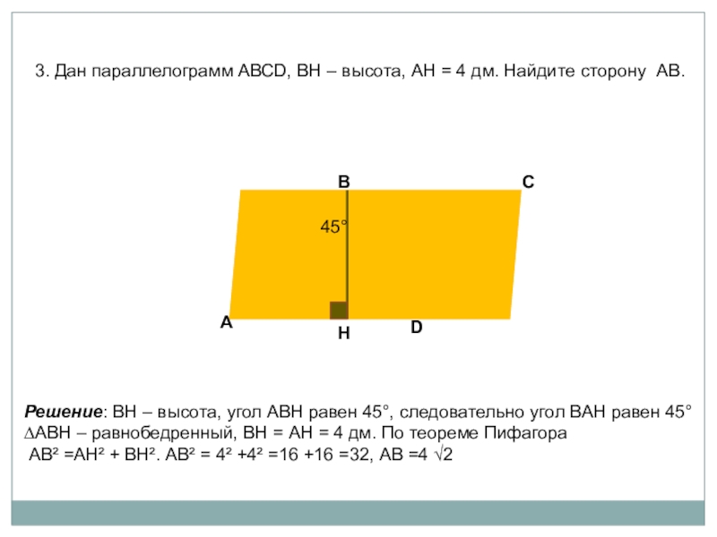 ∆АВН – равнобедренный, ВН = АН = 4 дм. По теореме Пифагора