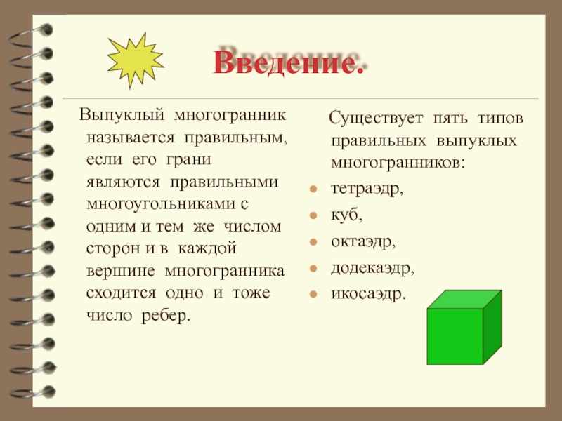 Существует пять типов правильных выпуклых многогранников: