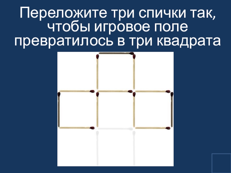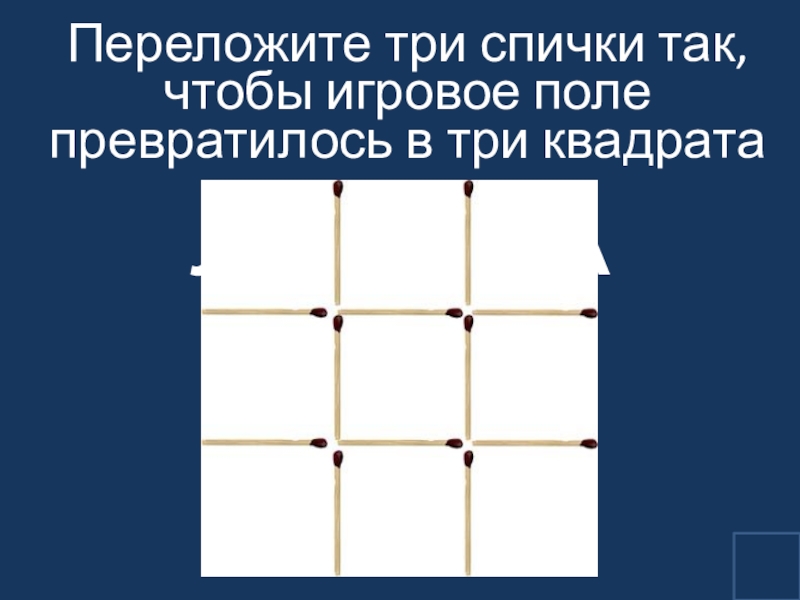Слайд 21Переложите три спички так, чтобы игровое поле превратилось в три квадрата