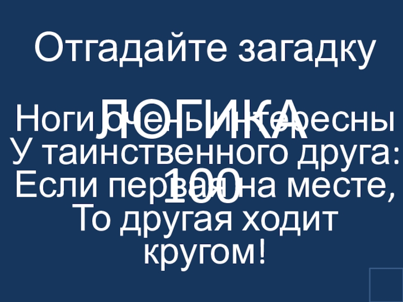 ЛОГИКА 100Отгадайте загадку  Ноги очень интересны У таинственного друга: Если первая на месте, То другая ходит