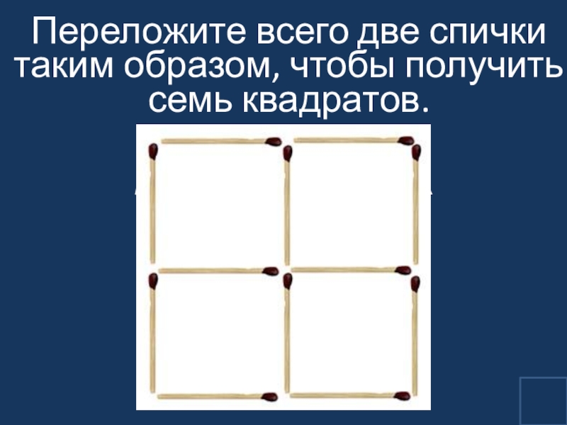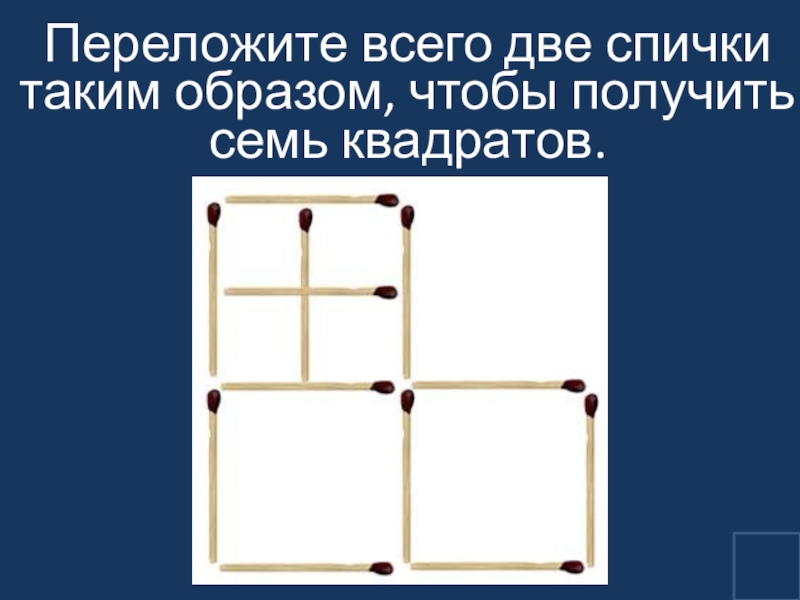 Слайд 23Переложите всего две спички таким образом, чтобы получить семь квадратов.