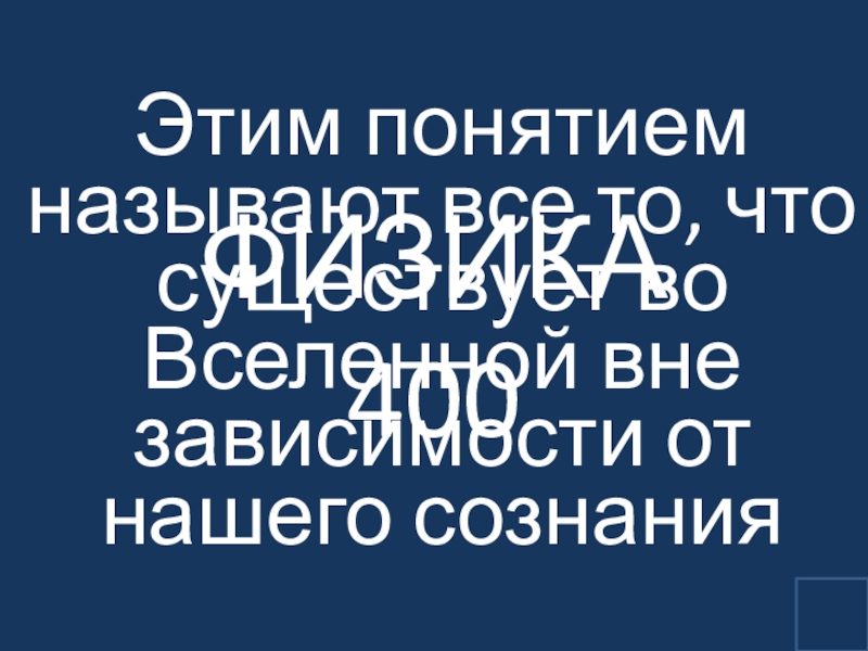 ФИЗИКА 400Этим понятием называют все то, что существует во Вселенной вне зависимости от нашего сознания