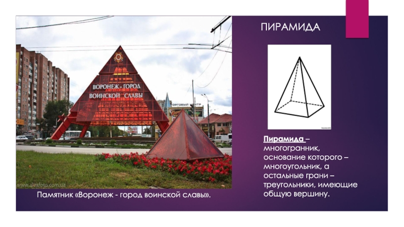 Пирамида – многогранник, основание которого – многоугольник, а остальные грани – треугольники, имеющие общую вершину.