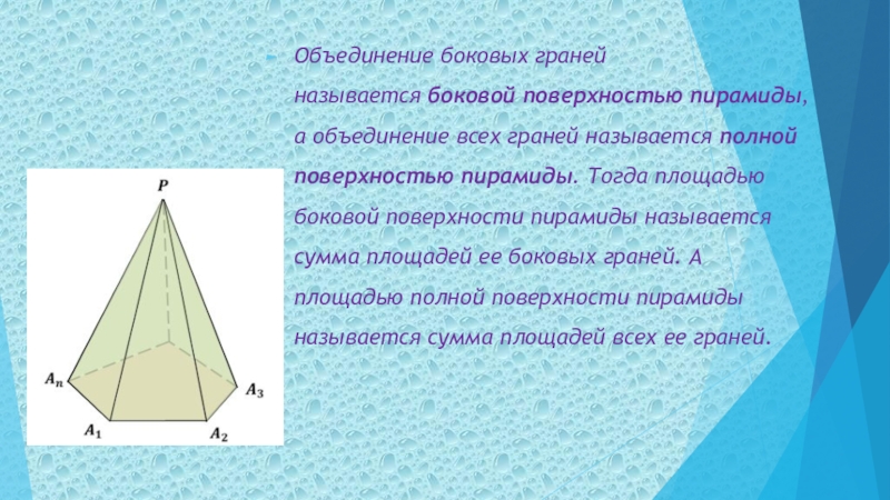 Слайд 12Объединение боковых граней называется боковой поверхностью пирамиды, а объединение всех граней называется полной