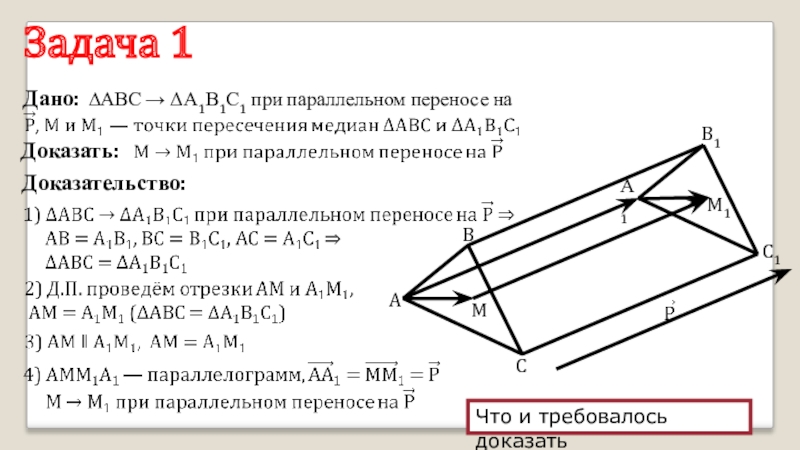 Задача 1Доказательство:Дано:∆АВС → ΔА1В1С1 при параллельном переносе наДоказать:      ABMCM1C1B1А1 Что и требовалось доказать