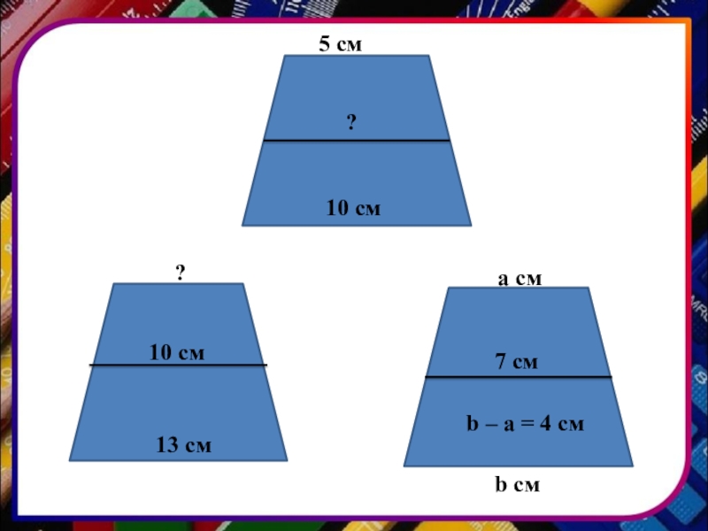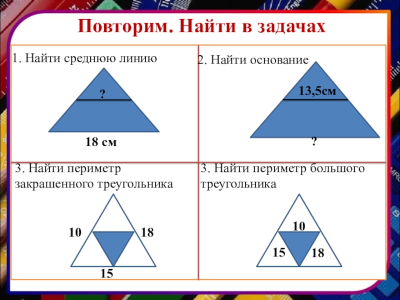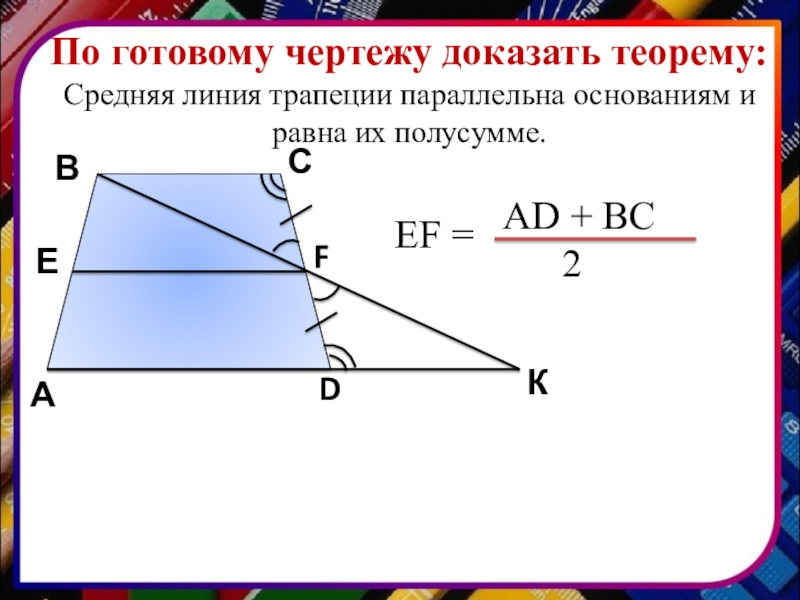 Задача: Дана трапеция, основания которой равны 14 см и 20 см. Боковые стороны 13 см и 8 см. Точки E и F делят боковые стороны пополам. Отрезок EF делит трапецию на две фигуры. Найдите периметр данной трапеции и получившихся фигур.