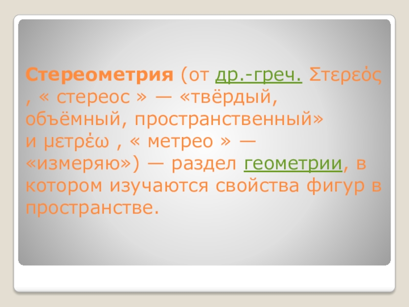 Слайд 2Стереометрия (от др.-греч. Στερεός , « стереос » — «твёрдый, объёмный, пространственный» и μετρέω , «