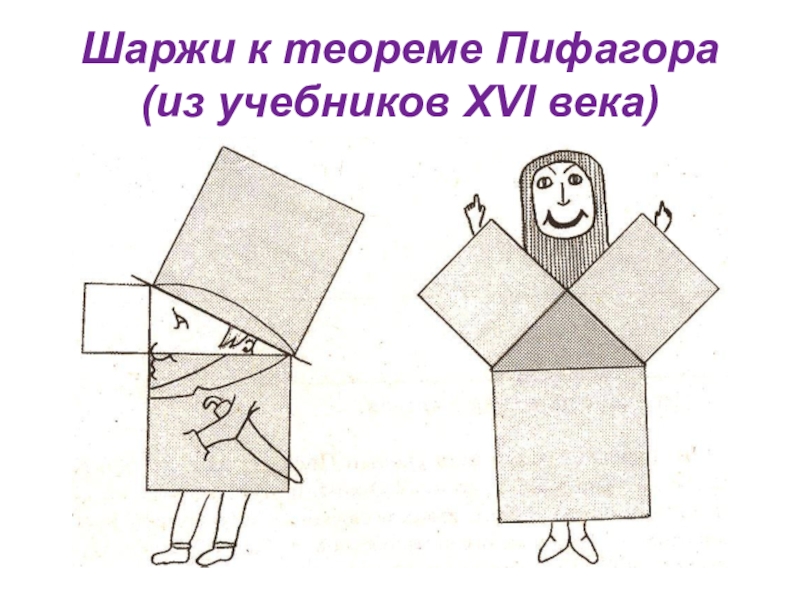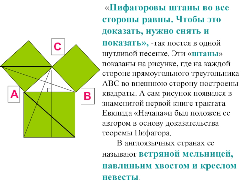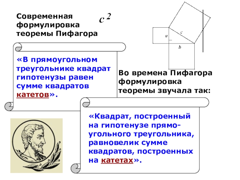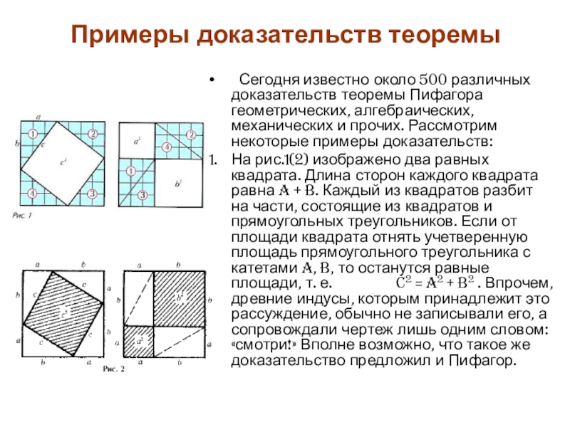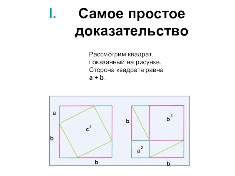 В другом случае (справа) квадрат разбит на два квадрата со сторонами a и b и четыре прямоугольных треугольника с катетами a и b.
