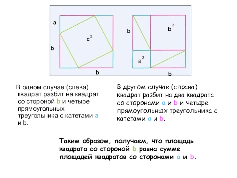 Таким образом, получаем, что площадь квадрата со стороной b равна сумме площадей квадратов со сторонами a и b.