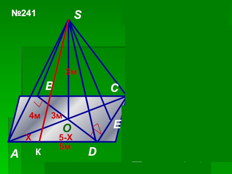 4)SK2=AS2-AK2=SD2-KD2, 89/4-х2=25/4- (5-х)2, х =4,1; SK2=22,25 – 4,12=5,44, SK=2√34/5м; SΔSAD=½AD·SK=½·5·2√34/5==√34м2