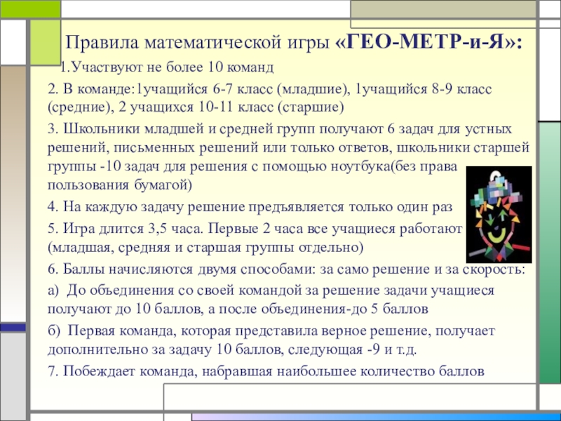 Слайд 5Правила математической игры «ГЕО-МЕТР-и-Я»: