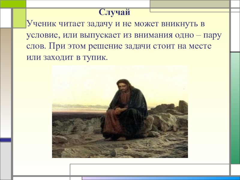 Случай Ученик читает задачу и не может вникнуть в условие, или выпускает из внимания одно – пару слов. При этом решение задачи стоит на месте или заходит в тупик.