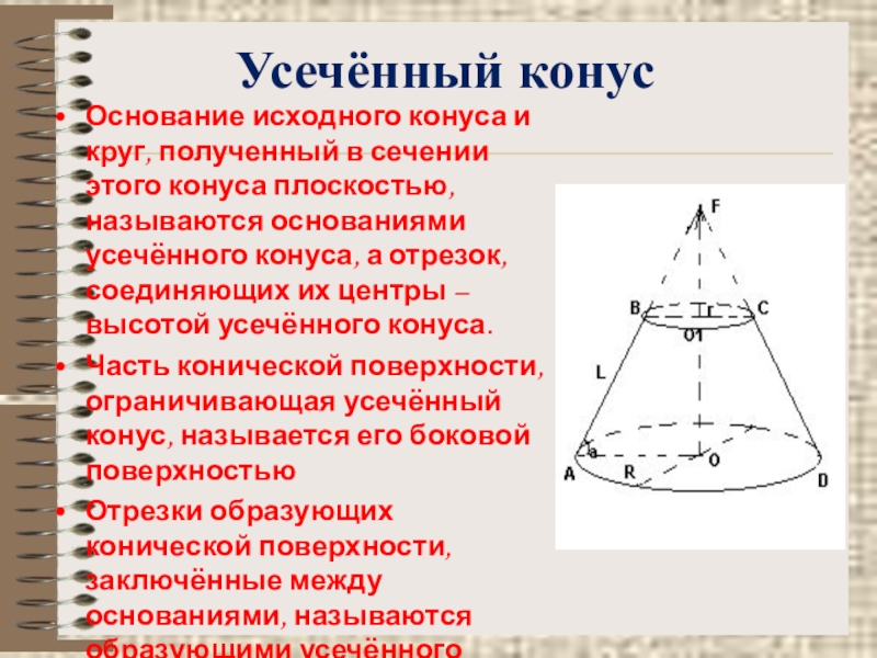 плоскостью, называются основаниями усечённого конуса, а отрезок, соединяющих их центры – высотой усечённого конуса.