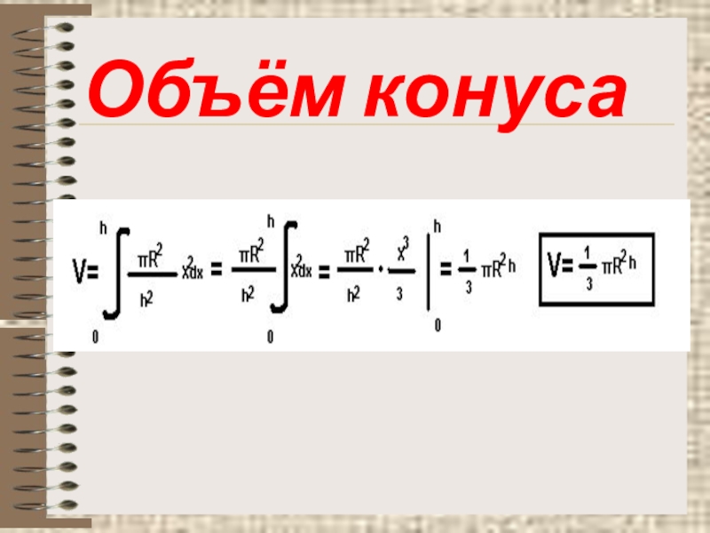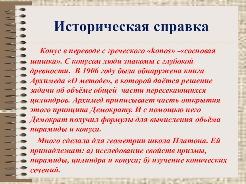 -«сосновая шишка». С конусом люди знакомы с глубокой древности. В 1906 году была обнаружена книга Архимеда «О методе», в которой даётся решение задачи об объёме общей части пересекающихся цилиндров. Архимед приписывает часть открытия этого принципа Демократу. И с помощью него Демократ получил формулы для вычисления объёма пирамиды и конуса.