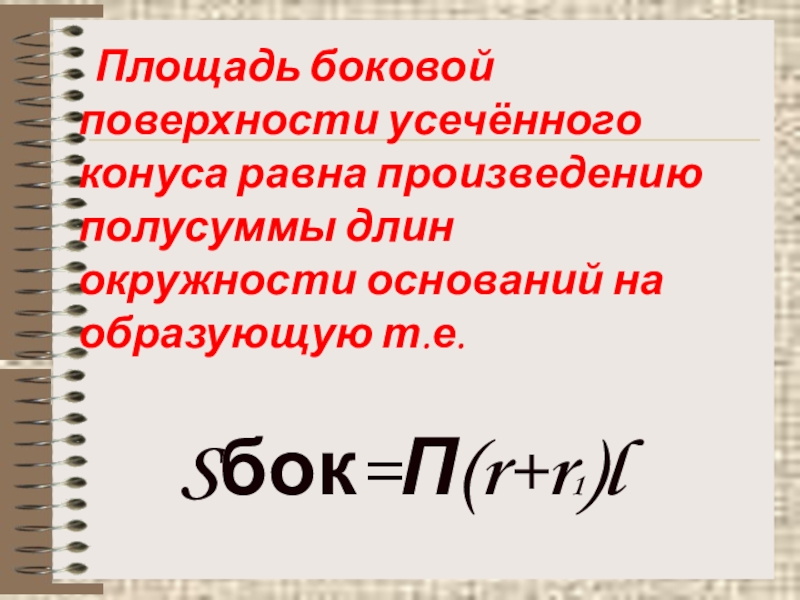 Слайд 27 Площадь боковой поверхности усечённого конуса равна произведению полусуммы