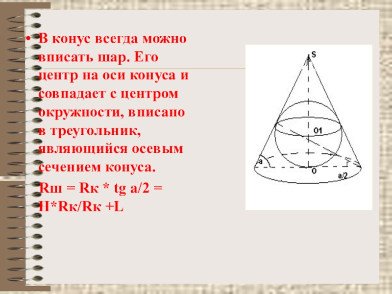 Слайд 24В конус всегда можно вписать шар. Его центр на оси конуса
