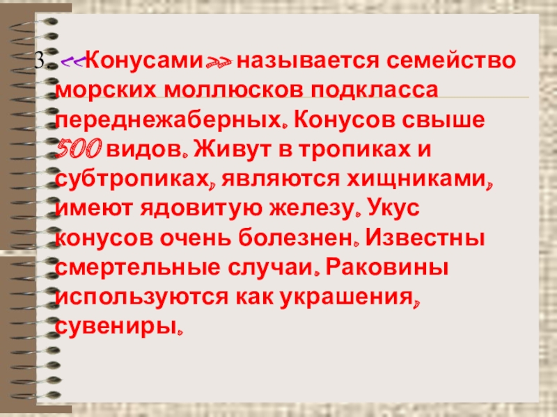 Слайд 303. «Конусами» называется семейство морских моллюсков подкласса переднежаберных. Конусов свыше 500
