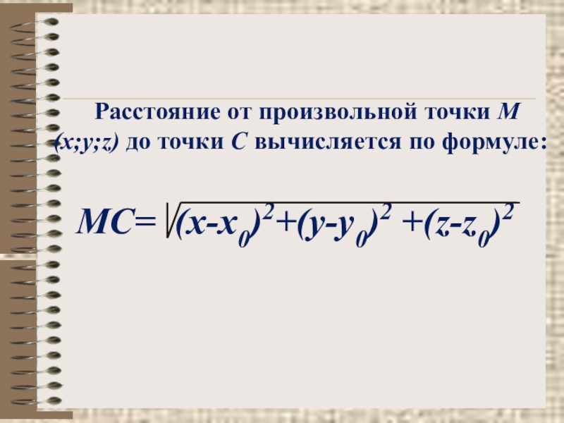 Слайд 36 Расстояние от произвольной точки M (x;y;z) до точки С вычисляется