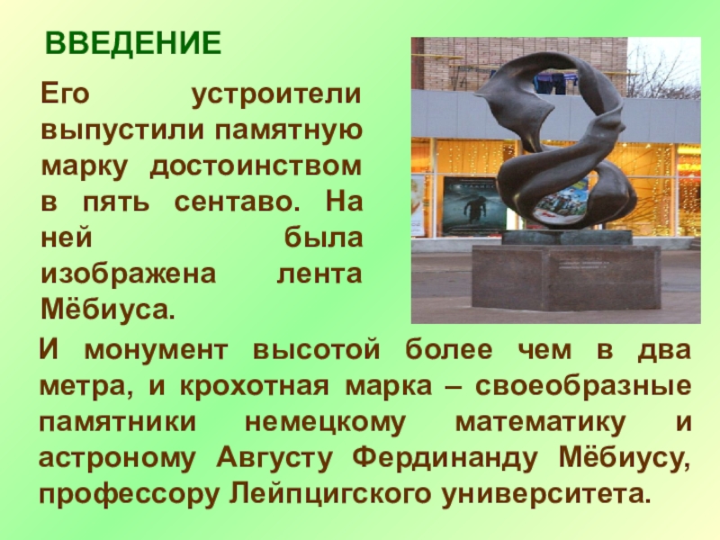 И монумент высотой более чем в два метра, и крохотная марка – своеобразные памятники немецкому математику и астроному Августу Фердинанду Мёбиусу, профессору Лейпцигского университета.