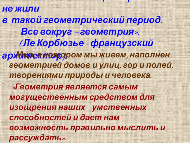 «Геометрия является самым могущественным средством для изощрения наших умственных способностей и дает нам возможность правильно мыслить и рассуждать».