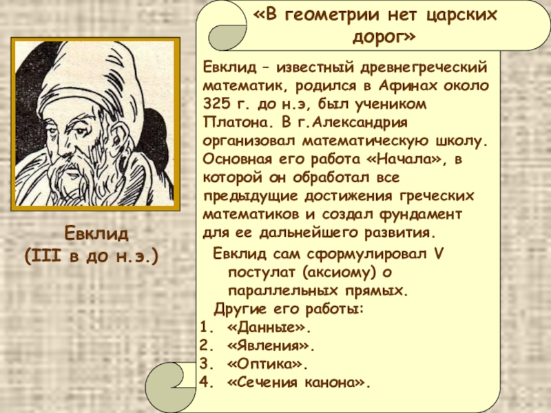 Евклид сам сформулировал V постулат (аксиому) о параллельных прямых.