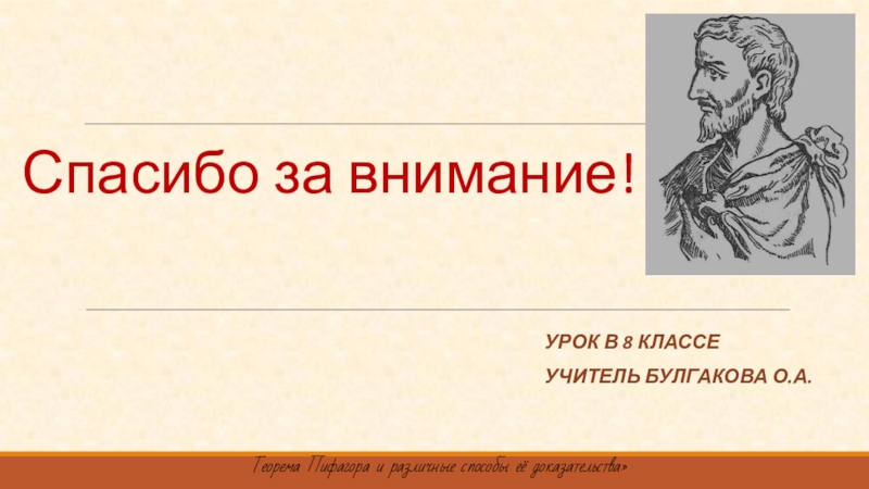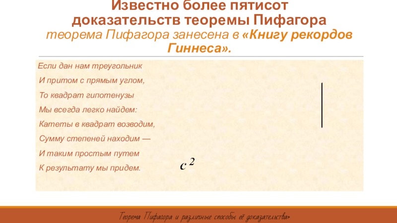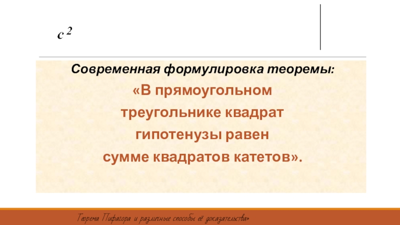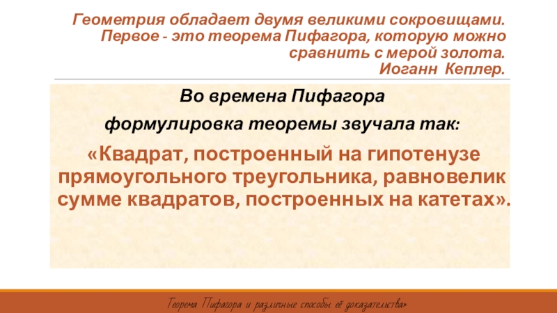 «Квадрат, построенный на гипотенузе прямоугольного треугольника, равновелик сумме квадратов, построенных на катетах».