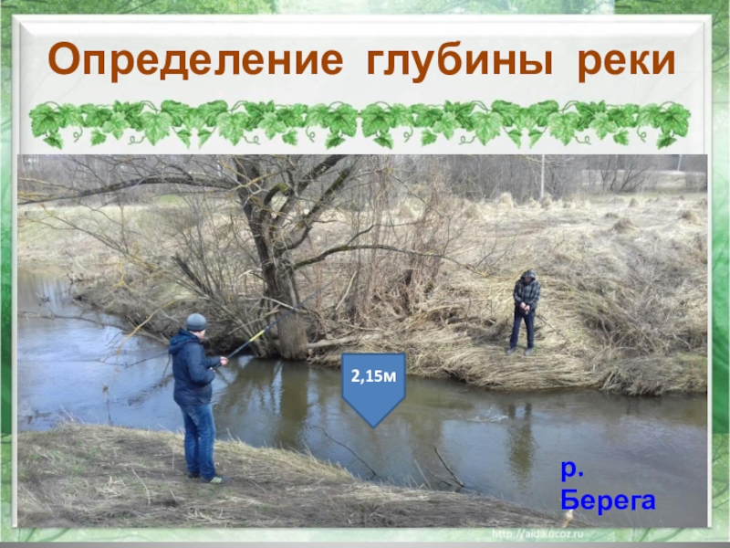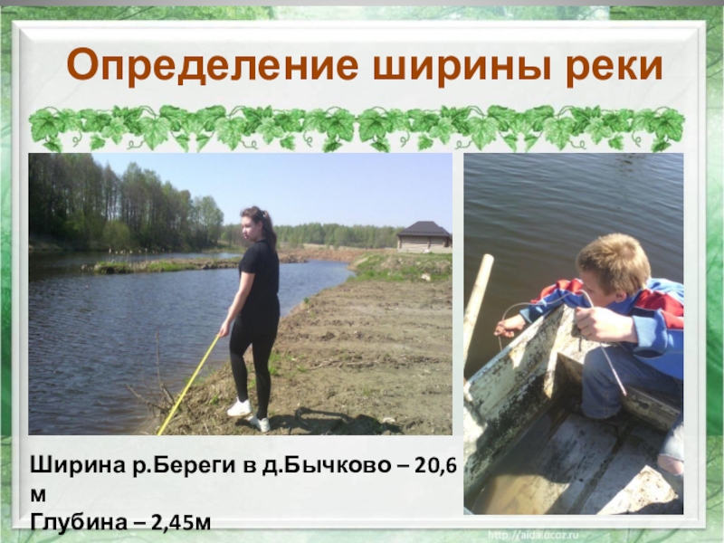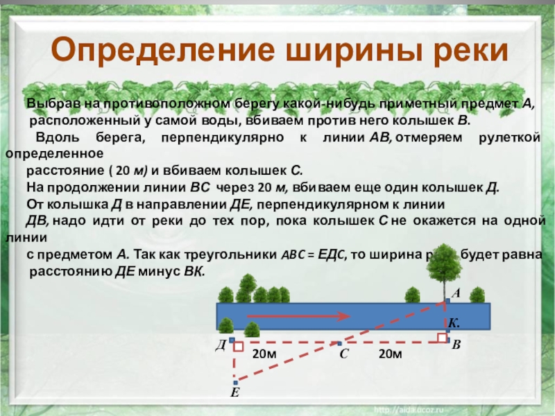 вехи С и D. Одна из девочек с часами становится позади колышка D. Другая – с пластмассовой бутылкой заходит несколько выше вехи А, бутылку бросает в воду, а сама становится позади вехи С. Обе смотрели вдоль направлений СА и DВ на поверхность воды. В тот момент, когда бутылка пересекает продолжение линии СА, первый наблюдатель взмахивает рукой. По этому сигналу второй наблюдатель засекает время первый раз и еще раз, когда бутылка пересечет направление DВ.