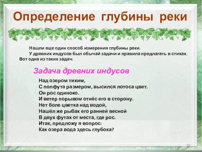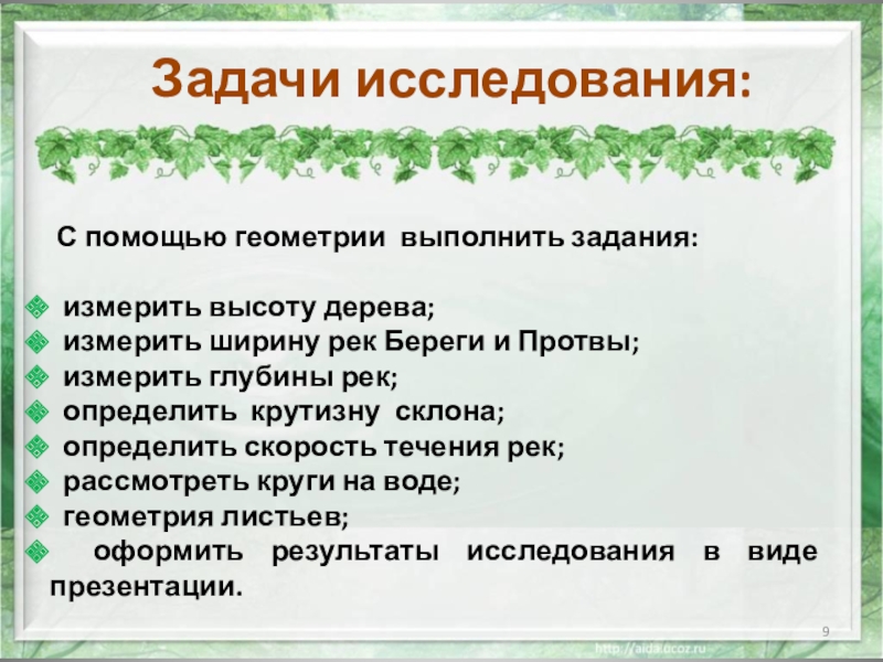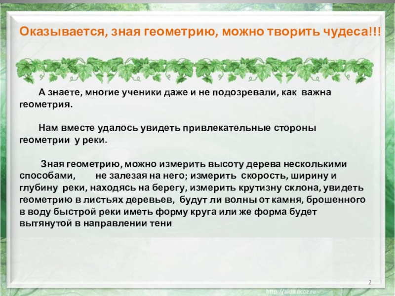 Зная геометрию, можно измерить высоту дерева несколькими способами, не залезая на него; измерить скорость, ширину и глубину реки, находясь на берегу, измерить крутизну склона, увидеть геометрию в листьях деревьев, будут ли волны от камня, брошенного в воду быстрой реки иметь форму круга или же форма будет вытянутой в направлении тени.