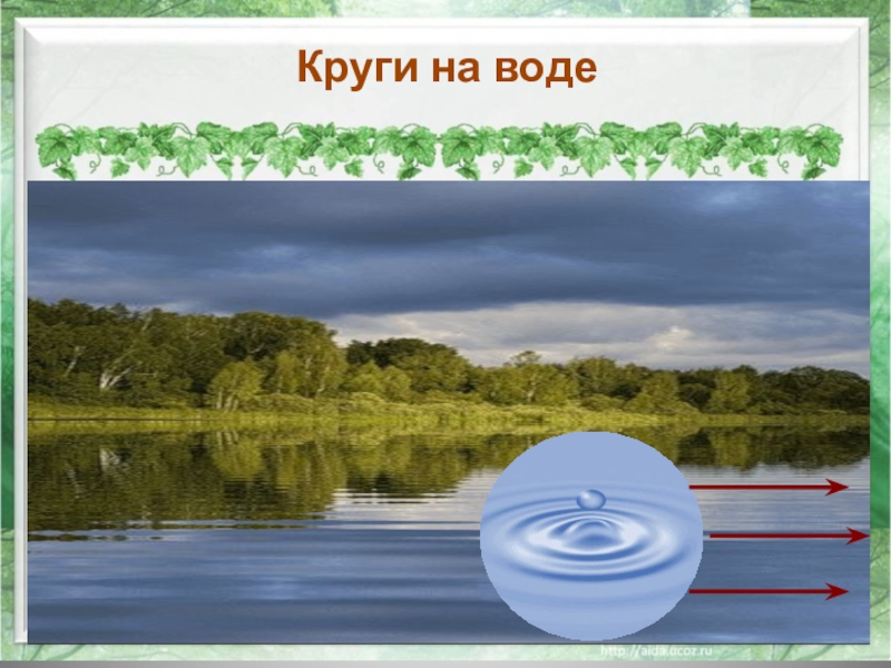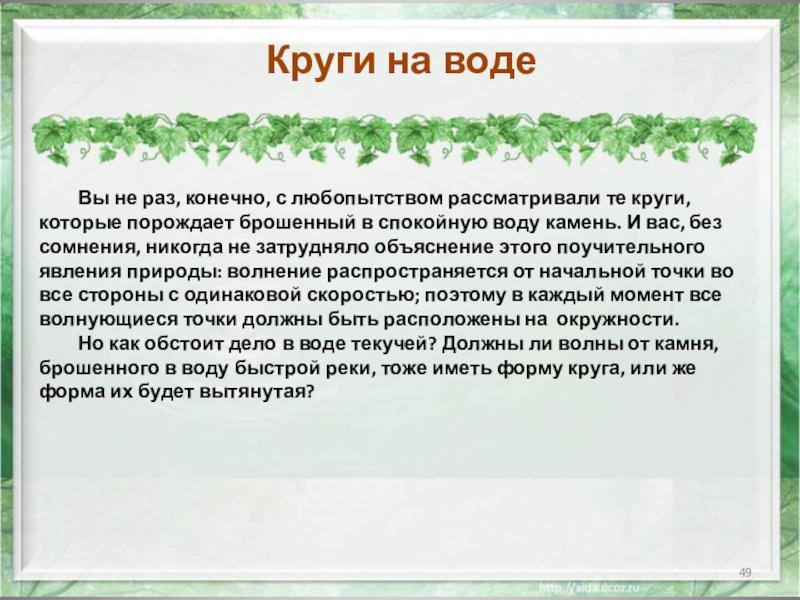 в текучей воде круговые волны должны вытянуться в ту сторону, куда увлекает их течение: волнение передается по течению быстрее, чем против течения и в боковых направлениях. Поэтому волнующиеся части водной поверхности должны, казалось бы, расположиться по некоторой вытянутой замкнутой кривой, т.е. не по окружности.