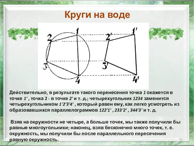 Взяв на окружности не четыре, а больше точек, мы также получили бы равные многоугольники; наконец, взяв бесконечно много точек, т. е. окружность, мы получили бы после параллельного пересечения равную окружность.