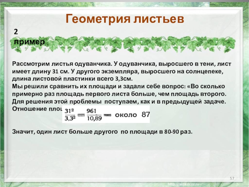 У липы от ее корней разрослась поросль. Сорвите лист и заметьте, как он велик по сравнению с листьями родительского дерева, - особенно с теми, что выросли на ярком солнце. Теневые листья, очевидно, возмещают недостаток света размерами своей площади, увеличивающей солнечные лучи. Разобраться в этом – задача ботаника. Но и геометр может сказать здесь свое слово: он может определить, во сколько именно раз площадь листа поросли больше площади листа родительского дерева.
