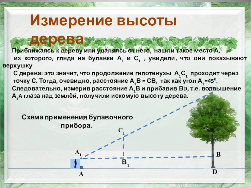 булавочного прибора. Здесь нужен шест, который воткнули в землю так, чтобы выступающая часть как раз равнялась росту одного из учеников. Место для шеста выбрали так, чтобы, лежа, как показано на рисунке, видели верхушку дерева на одной прямой линии с верхней точкой шеста. Так как треугольник АВ1С1 – равнобедренный и прямоугольный, то угол А=450 и, следовательно, АВ равно ВС, т.е. искомой