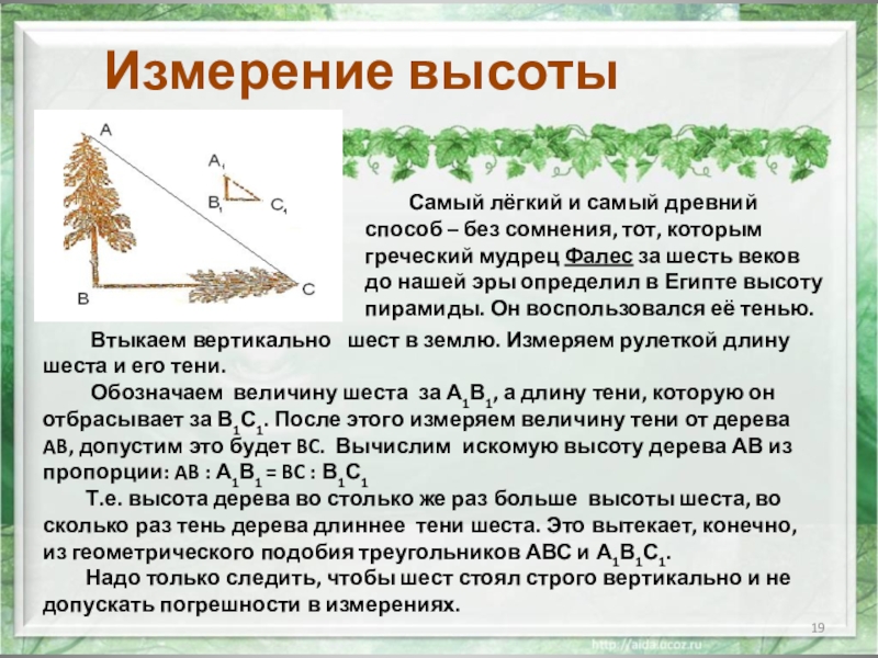 Т.е. высота дерева во столько же раз больше высоты шеста, во сколько раз тень дерева длиннее тени шеста. Это вытекает, конечно, из геометрического подобия треугольников АВС и А1В1С1.
