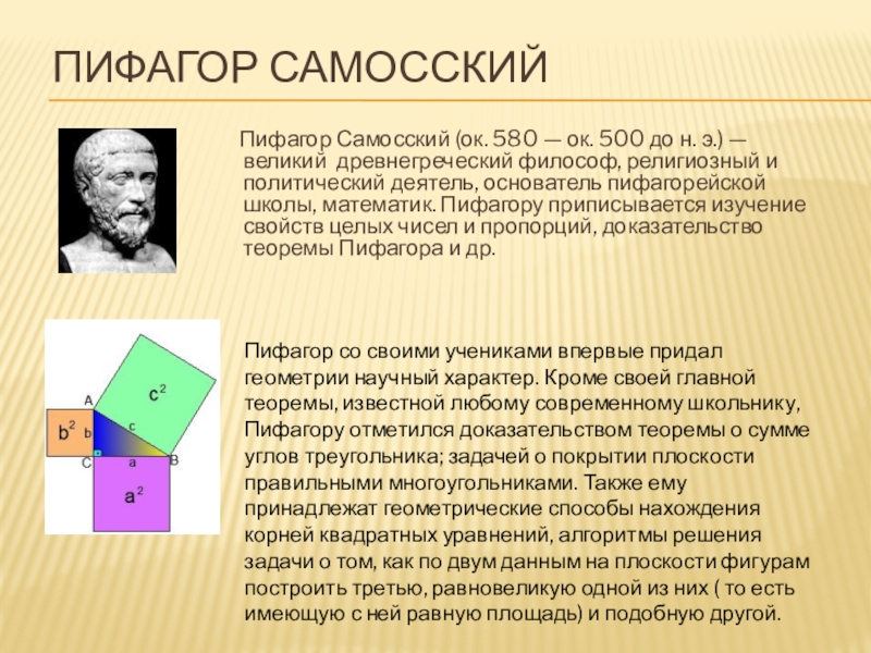 Пифагор со своими учениками впервые придал геометрии научный характер. Кроме своей главной теоремы, известной любому современному школьнику, Пифагору отметился доказательством теоремы о сумме углов треугольника; задачей о покрытии плоскости правильными многоугольниками. Также ему принадлежат геометрические способы нахождения корней квадратных уравнений, алгоритмы решения задачи о том, как по двум данным на плоскости фигурам построить третью, равновеликую одной из них ( то есть имеющую с ней равную площадь) и подобную другой.